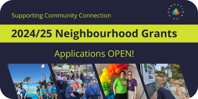 | The Foundation SA Neighbourhood Grants offer non-profit organisations, up to $5,000 to support acts of community connection that strengthen the bonds of neighbourhoods, led by people in their own communities. Check out the Grant Guidelines here. Grant applications close on 23 October 2024. |