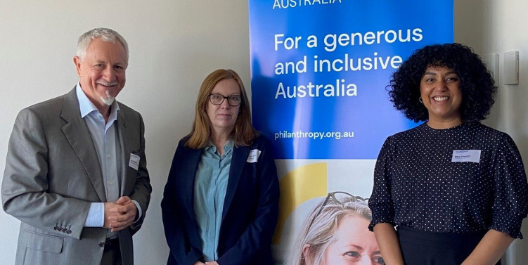 Banner image caption left to right: Jack Heath, CEO, Philanthropy Australia, Professor Dame Sarah Gilbert and Mary Chackola.