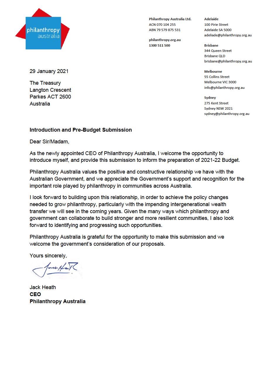Philanthropy Australia’s submission to the Australian Government ahead of the 2021–22 Budget. The submission reiterates our Policy Priorities for a Post-COVID-19 Australia, framed within the context of 2021 and the path to economic recovery.