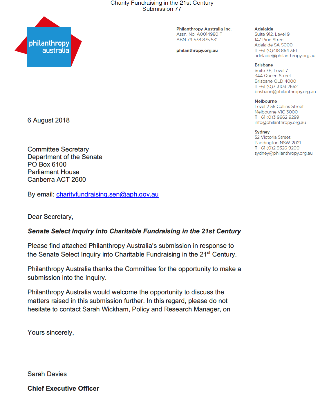 Senate Select Committee on Charity Fundraising in the 21st Century submission 2018