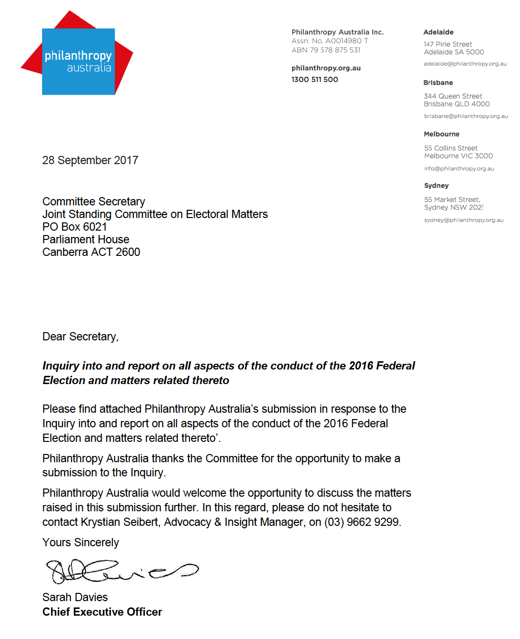 Philanthropy Australia’s submission in response to the Australian Parliament’s Joint Standing Committee on Electoral Inquiry into and report on all aspects of the conduct of the 2016 Federal Election and matters related thereto submission.