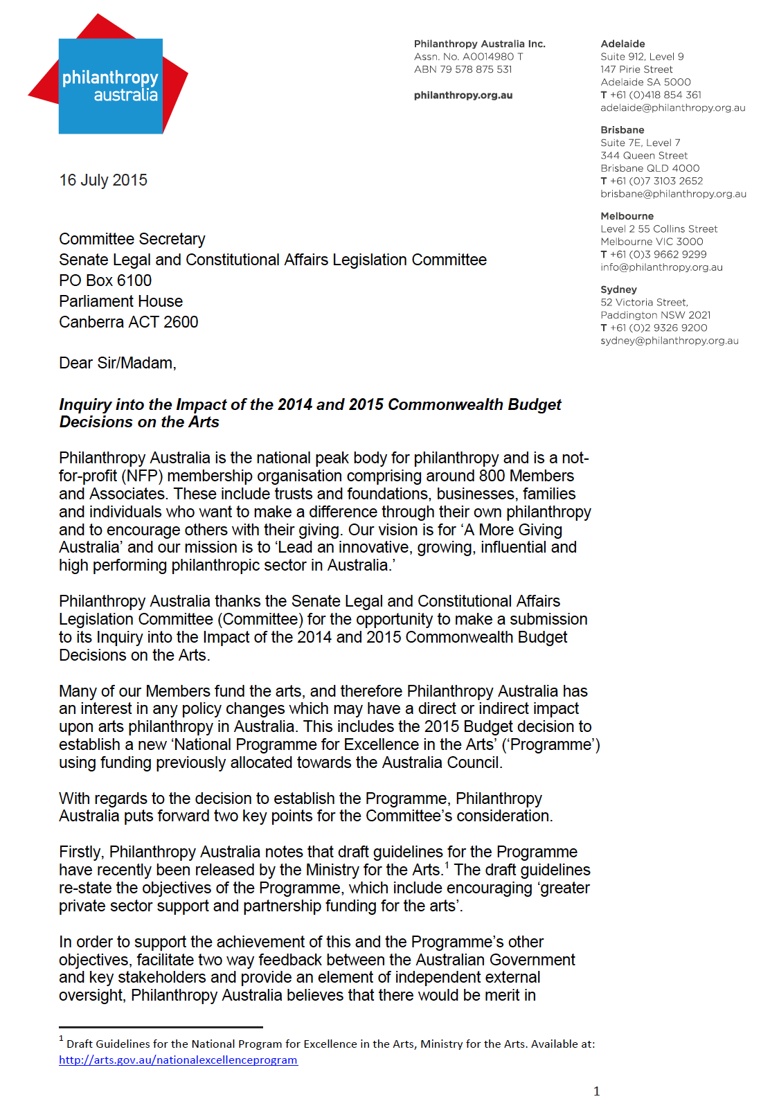 Philanthropy Australia’s submission in response to the Senate Legal and Constitutional Affairs References Committee inquiry into the impact of the 2014 and 2015 Commonwealth Budget decisions on the Arts.