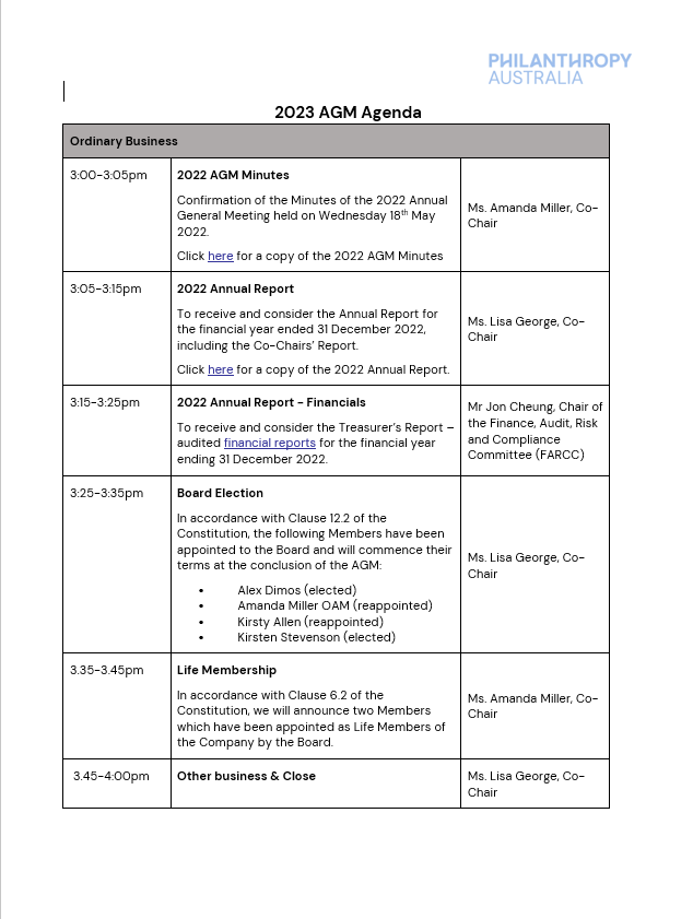 Agenda for Philanthropy Australia’s 2023 Annual General Meeting