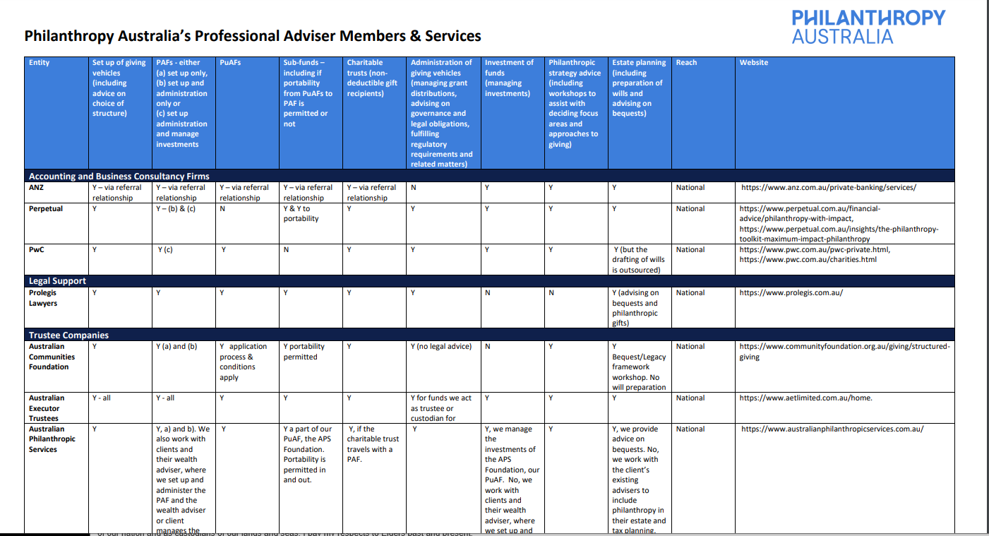 We have a created a list of Philanthropy Australia members who provide professional advisory services – such as setting up a giving structure or managing investments.