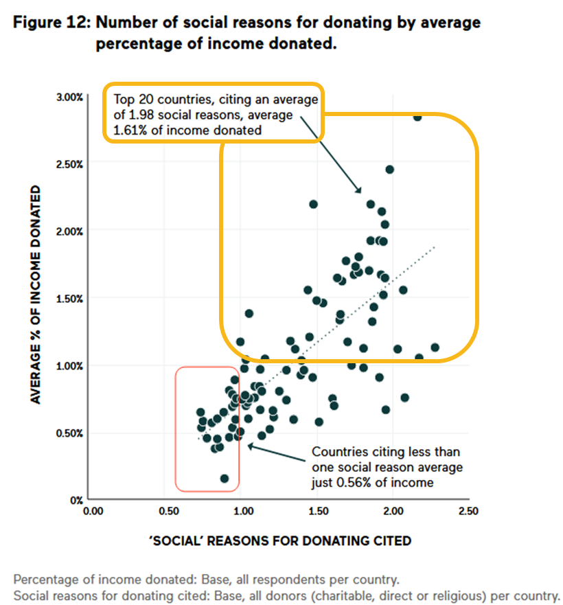 The report found that the social norms in a society were positively related to generosity: if there were more social norms – social reasons – for donating, this correlated with a higher average percentage of income donated. As shown in the graph below, where there was more than one social reason to give, the average percentage of income donated increased above 1% in many countries.