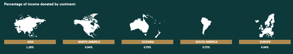 - Australia was ranked 68th in the World Giving Report with an average percentage of income donated of 0.73%, behind peers such as New Zealand (ranked 61 with 0.76% average percentage of income donated), Canada (ranked 57 and 0.80%) and the USA (ranked 46 and 0.97%)