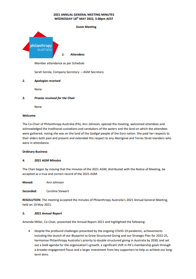 Minutes for Philanthropy Australia’s 2021 Annual General Meeting, which took place on Wednesday18th May 2022, 3.00pm AEST