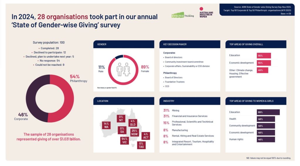 The State of Gender-wise Giving Survey was produced in partnership with The Evolved Group and leverages research by John McLeod, JBWere Philanthropic Services and Jarrod Miles, Strive Philanthropy and GivingLarge.