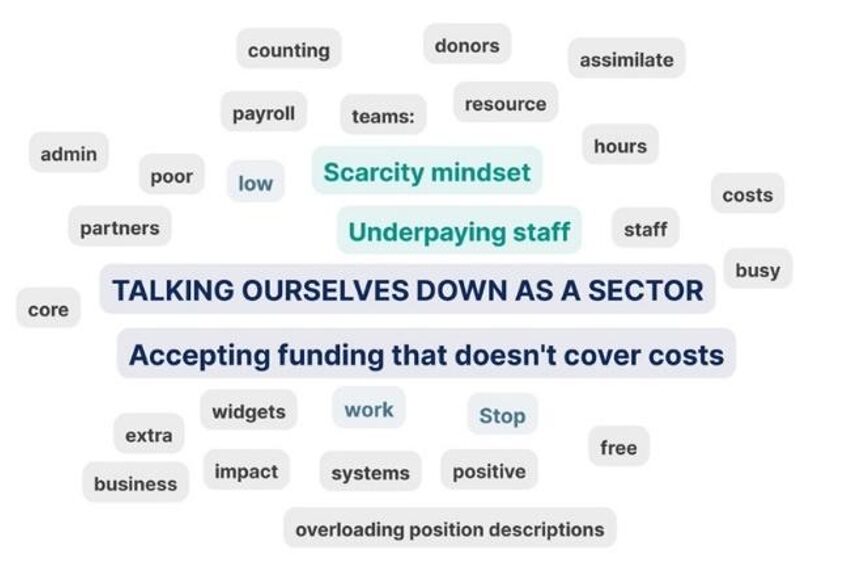 The number one statement in the ‘Stop’ activity that was upvoted was “talking ourselves down as a sector”, shortly followed by “accepting funding that doesn’t cover the costs”, with “scarcity mindset”, “overloading position descriptions” and “underpaying staff” coming in after that.