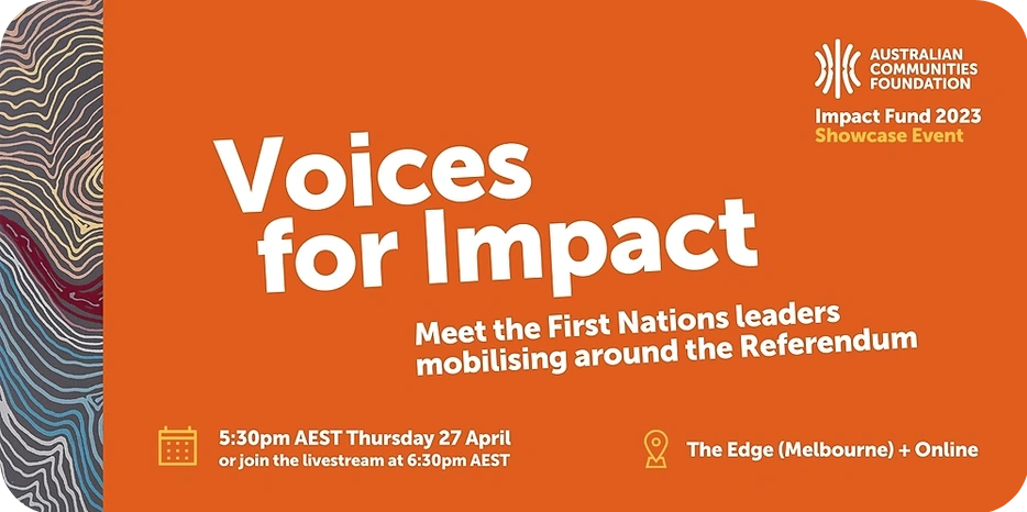 Join Australian Communities Foundation for an evening of inspiring conversation around philanthropy's role in supporting First Nations leaders mobilising around the upcoming Referendum. The ACF Impact Fund will be funding a range of initiatives presenting on the night and inviting co-contributions after the event. Speakers include leaders from Yes 23, the Uluru Dialogue and Passing the Message Stick and Jack Heath, CEO of Philanthropy Australia. Spaces limited.