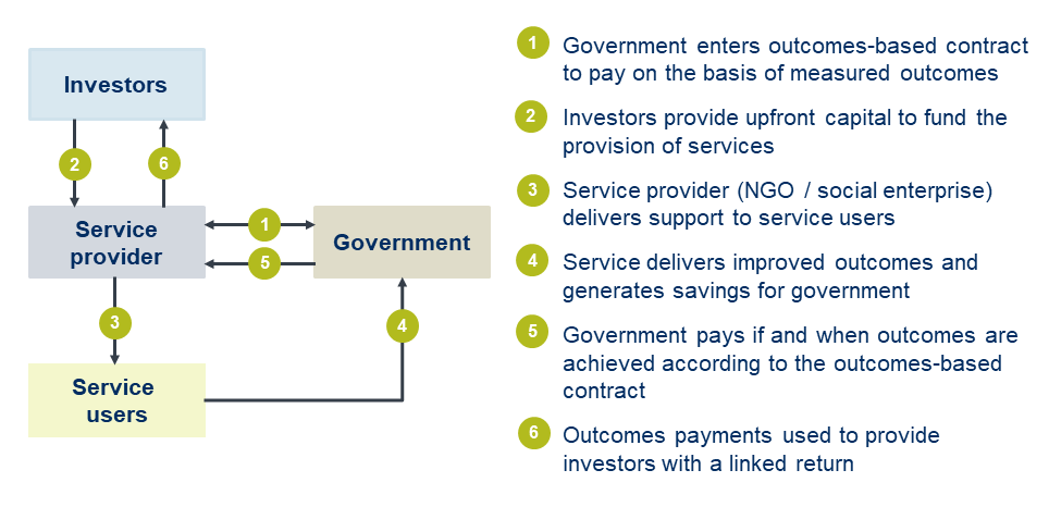 A SIB is a financing mechanism that enables a service provider to enter into an outcomes contract with government. Under an outcomes contract, a portion of payments from government are linked to the outcomes achieved by the service provider’s program. With a social impact bond, private investors provide upfront working capital for the delivery a program, and investor returns are linked to the outcomes achieved by the program.