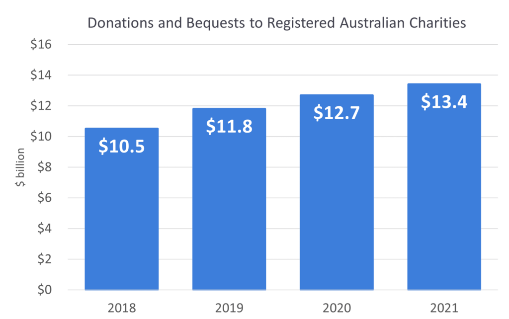Grants and distributions by charities for use within Australia was measured by the ACNC as having increased 5% to $9.7 billion in 2021. It was reported in the Australian Financial Review that this figure is insufficient to hit the federal government’s goal to double all giving by 2030.
