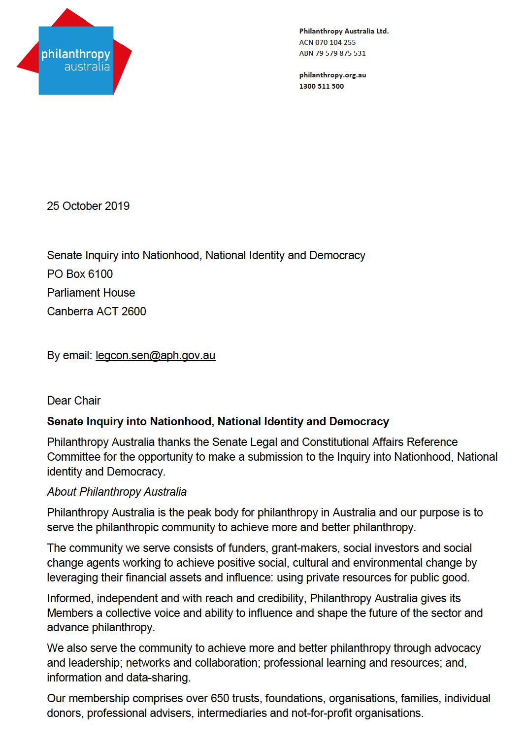 Our submission to the Senate Legal and Constitutional Affairs References Committee Inquiry into Nationhood, National identity and Democracy focused on philanthropy’s role in democracy.