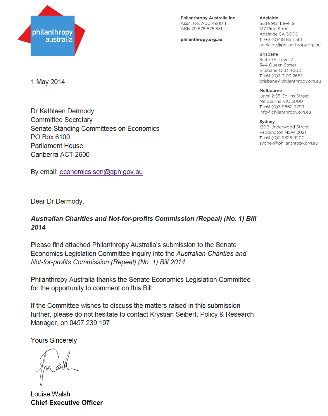 Our submission in response to the Senate Economics Legislation Committee Inquiry into the Australian Charities and Not-for-profits Commission (Repeal) (No. 1) Bill 2014.