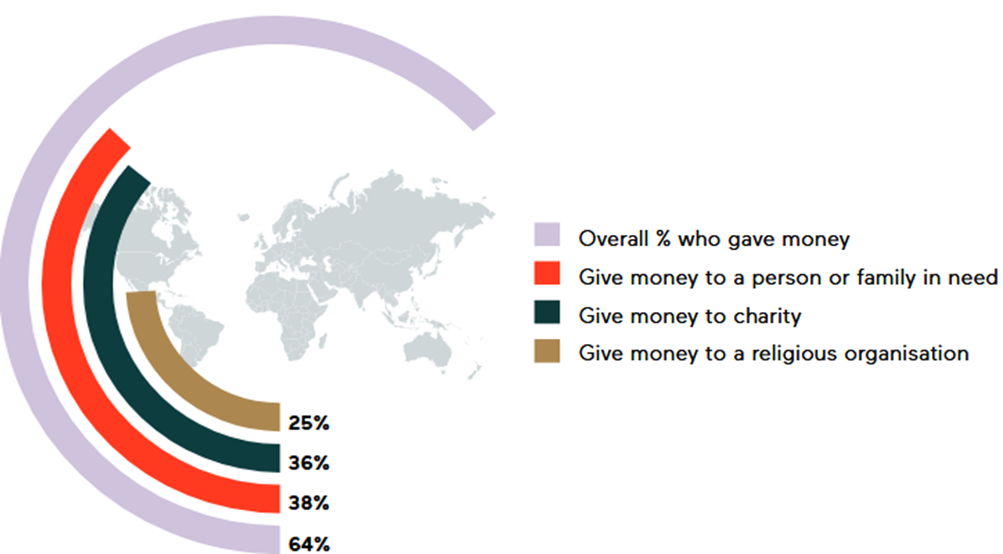 - Almost two-thirds (64%) of people globally gave money to good causes in 2024