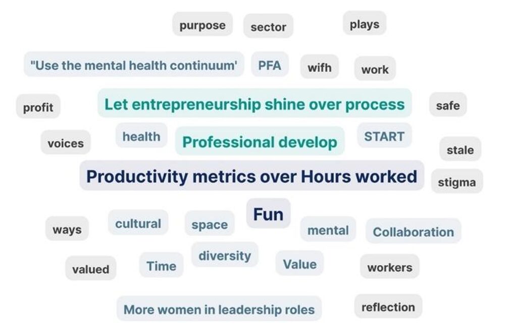 The number one statement upvoted in the ‘Start’ activity was “productivity metrics over hours worked”, followed by “professional development”, “let entrepreneurship shine over process”; “use the mental health continuum”; and “more women in leadership roles”.