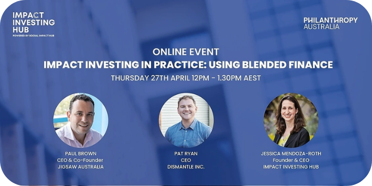 Blended finance refers to a combination of financing to meet the needs of for-purpose organisations - for example, part debt and part grants. It is a structuring approach that typically sees impact investors with different expectations coming together to provide capital to impact investing deals. |